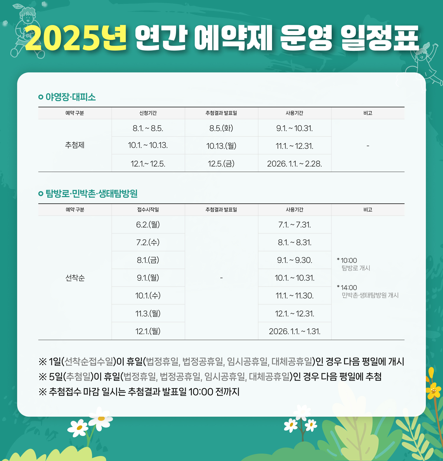 국립공원 대피소 예약 추첨제 전면도입에 따라 연간 운영일정을 재공지드립니다.